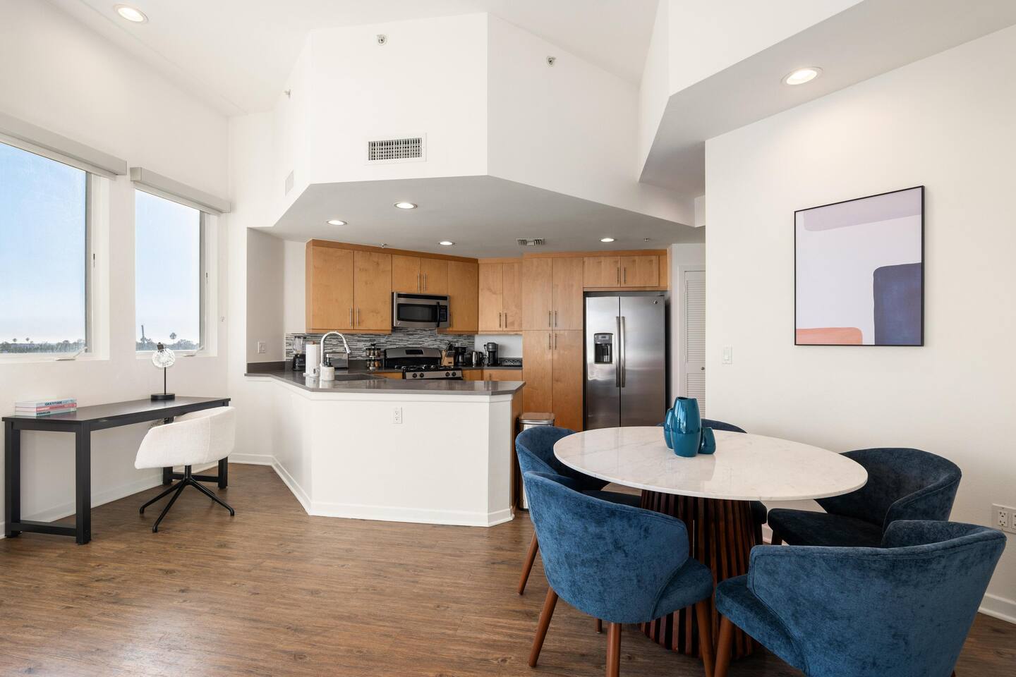 Indulge in the epitome of luxury with our meticulously designed deluxe penthouse, nestled in an upscale LA neighborhood. This thoughtfully curated space is the perfect haven for both short-term getaways and extended stays, promising days filled with bliss, nights of unparalleled comfort, and the sensation of being at your home away from home. From the moment you step through the door, you'll be captivated by the seamless arrangement, exquisite furnishings, and a contemporary design enriched with Scandinavian influences. Every corner of this sanctuary exudes a pristine cleanliness that will leave you in awe. Enter the bright and spacious two-story penthouse, graced with high ceilings, elegant hardwood parquet floors, a designer seating area complemented by an eclectic glass table, and a smart HDTV. The first floor encompasses the well-appointed kitchen, a welcoming living room, an inviting dining area, and a convenient guest bathroom. Ascend to the second floor to discover the enchanting bedrooms adorned with plush carpeting. The master bedroom boasts a stunning marina view, an en-suite full bathroom with a bathtub, a double vanity sink, a walk-in closet, and an Eastern king bed with premium mattress and linens. The second bedroom features two Queen beds, an en-suite full bathroom with a bathtub, and a spacious walk-in closet. The state-of-the-art kitchen is fully equipped with modern stainless steel appliances and is graced by granite countertops, offering ample space to unleash your culinary skills and create sumptuous meals to be savored at the exquisite dining table. Rejuvenate your body and soul in the two immaculate bathrooms, designed for your ultimate relaxation. For those seeking exercise or a refreshing swim, simply head to the building's swimming pool and gym, available to all guests and residents. This residence is a symphony of quality, comfort, and luxury living. Our mission is to create a warm and inviting environment for our guests to unwind and relish every moment of their unforgettable holiday. Don't miss this enchanting oasis, complete with an array of amenities and furnishings that exemplify the finest in elegance and sophistication.