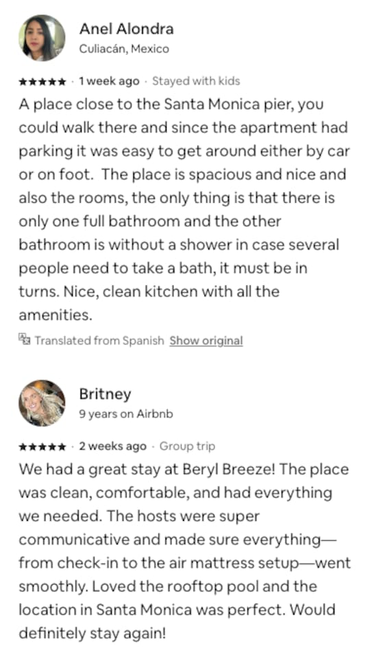 Guests have exclusive access to the entire duplex, including two generously sized bedrooms, spa-like bathrooms, and a seamless open-concept living area. The well-appointed kitchen, Private Rooftop, and reserved parking add to the convenience and luxury. Enjoy the epitome of coastal living in the heart of Santa Monica with all the comforts and captivating views. Just letting you know, we have air mattress, pack 'n play, and high chair available upon request. If you’d like any of these items for your stay, please let us know, and we’ll be happy to arrange it for you!