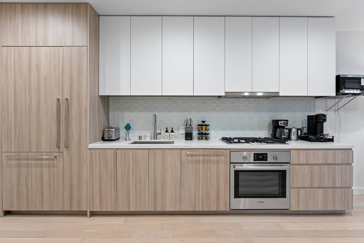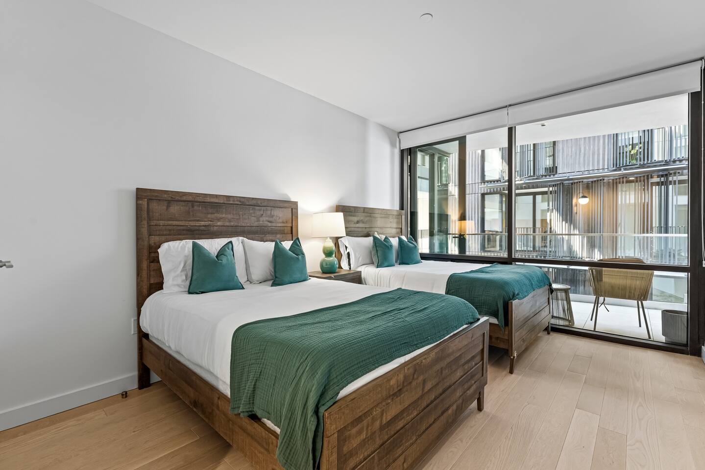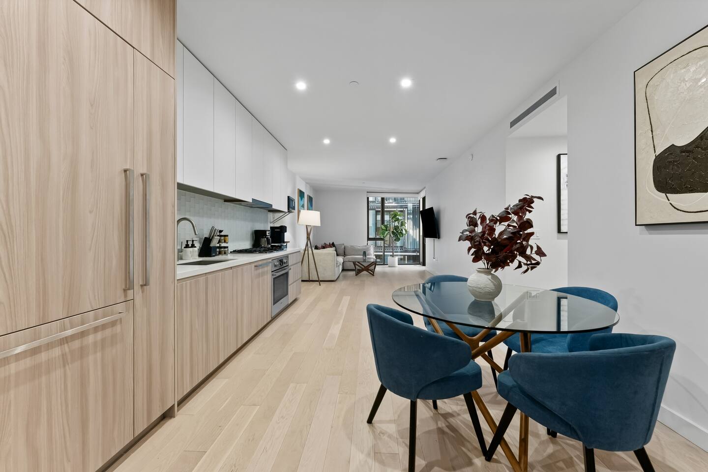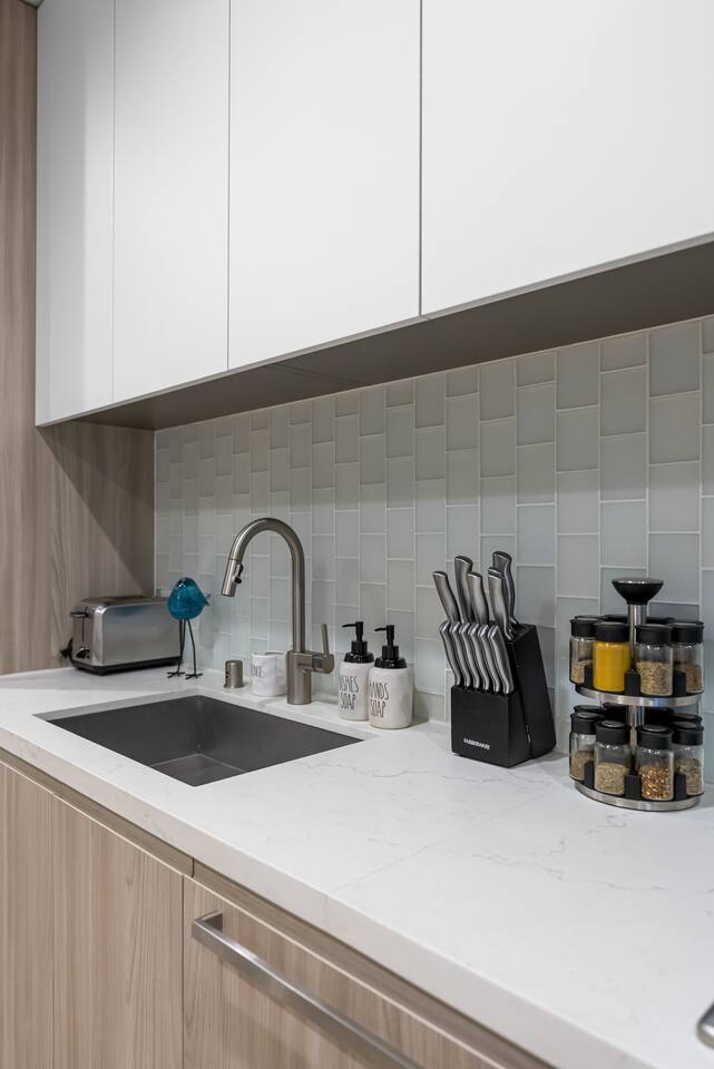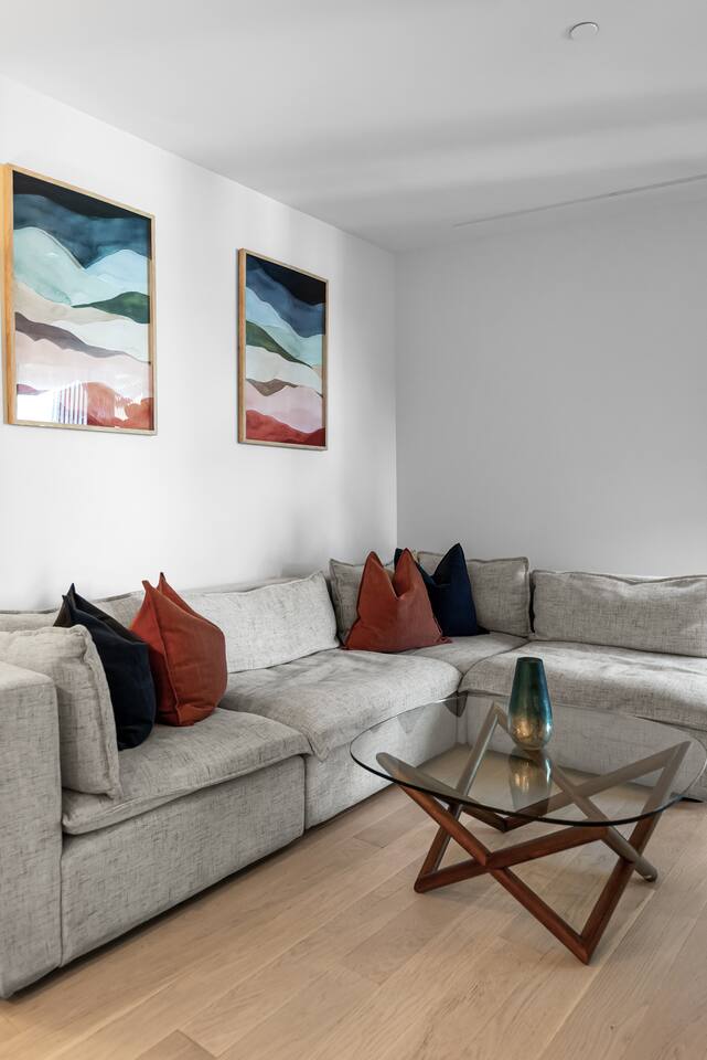 1,400 sq. ft. of bright, modern living designed for travelers who want hotel-level comfort with homelike warmth. ✨ Highlights ✅Floor-to-ceiling windows with city views & natural light ✅Spacious living room 65" Smart TV, L-shaped couch, private balcony ✅Custom white oak flooring throughout living areas ✅Central A/C & Heating (Nest Thermostat) ✅High-speed WiFi (1 Gbps) – stream, work, or game effortlessly ✅Pet-friendly – up to 2 pets ($99 each per stay) ✅Sleeping Arrangements: Sleeps 7 comfortably ✅Master: King bed + balcony + 55" TV + automatic blinds ✅Second bedroom: 2 Full beds + automatic blinds ✅Queen air mattress available upon request 🚿 Bathrooms ✅2 full bathrooms (1 ensuite tub/shower, 1 walk-in shower) ✅Towels, toiletries, and hair dryer provided 🍳 Fully Stocked Kitchen ✅Nespresso Vertuo & Drip Coffee Maker ☕ ✅Cookware, utensils, and dinnerware for full meals ✅Paper towels and basics provided ✅Open layout perfect for cooking and gathering 🧺 Laundry & Comfort ✅In-unit Bosch Washer & Dryer (detergent included) ✅Iron + Iron board ✅Extra linens & towels available upon request