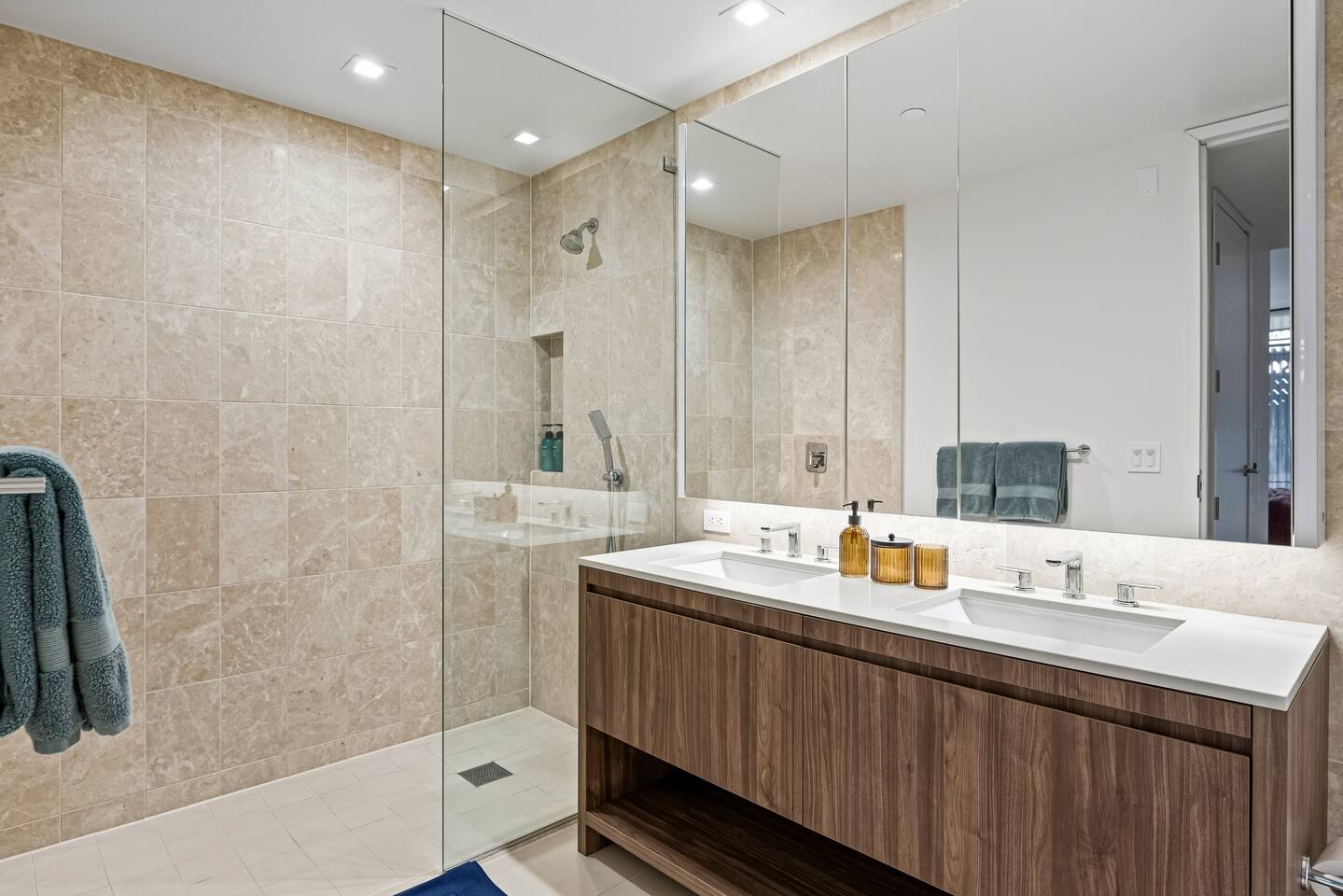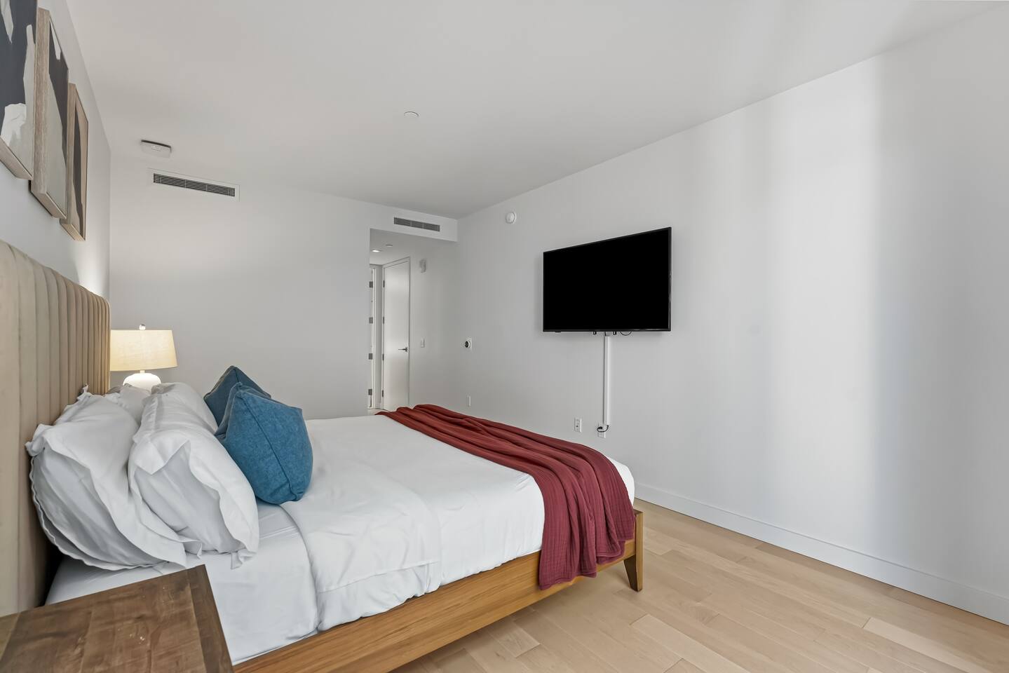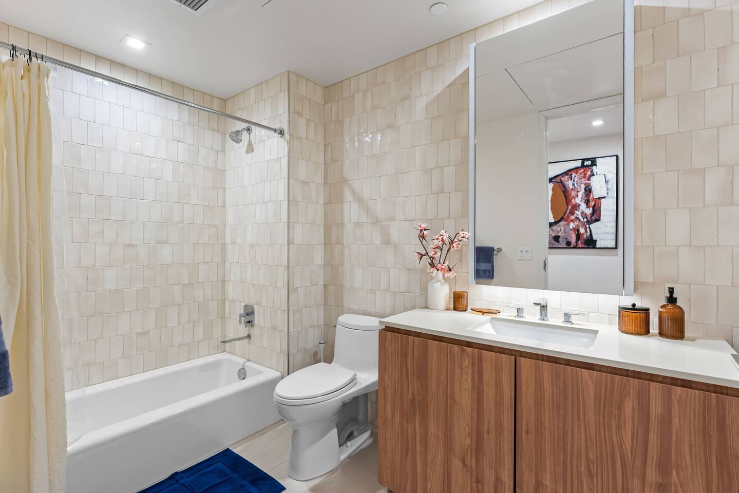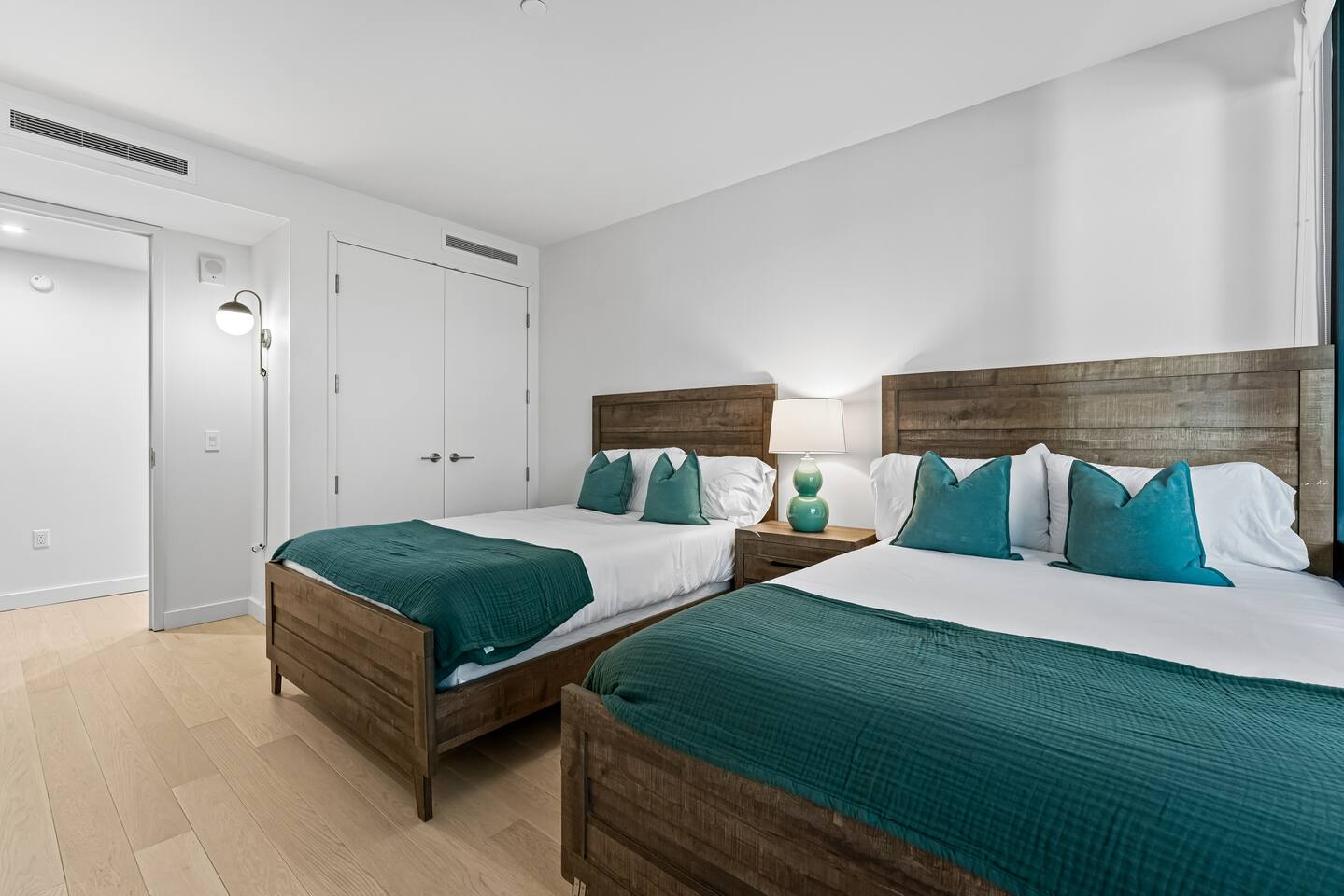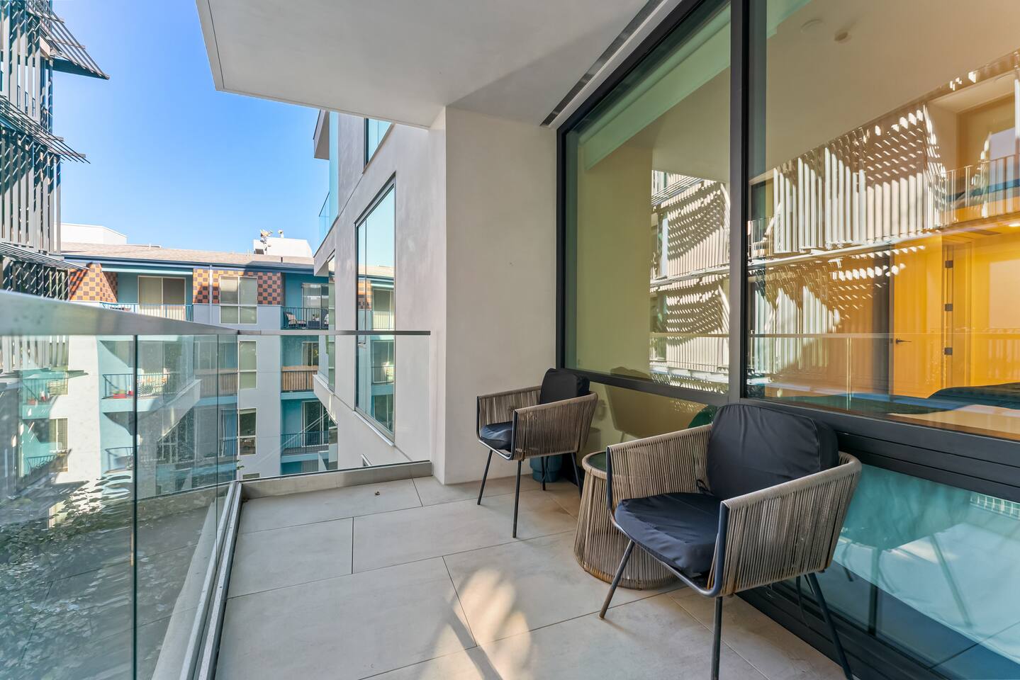 1,400 sq. ft. of bright, modern living designed for travelers who want hotel-level comfort with homelike warmth. ✨ Highlights ✅Floor-to-ceiling windows with city views & natural light ✅Spacious living room 65" Smart TV, L-shaped couch, private balcony ✅Custom white oak flooring throughout living areas ✅Central A/C & Heating (Nest Thermostat) ✅High-speed WiFi (1 Gbps) – stream, work, or game effortlessly ✅Pet-friendly – up to 2 pets ($99 each per stay) ✅Sleeping Arrangements: Sleeps 7 comfortably ✅Master: King bed + balcony + 55" TV + automatic blinds ✅Second bedroom: 2 Full beds + automatic blinds ✅Queen air mattress available upon request 🚿 Bathrooms ✅2 full bathrooms (1 ensuite tub/shower, 1 walk-in shower) ✅Towels, toiletries, and hair dryer provided 🍳 Fully Stocked Kitchen ✅Nespresso Vertuo & Drip Coffee Maker ☕ ✅Cookware, utensils, and dinnerware for full meals ✅Paper towels and basics provided ✅Open layout perfect for cooking and gathering 🧺 Laundry & Comfort ✅In-unit Bosch Washer & Dryer (detergent included) ✅Iron + Iron board ✅Extra linens & towels available upon request